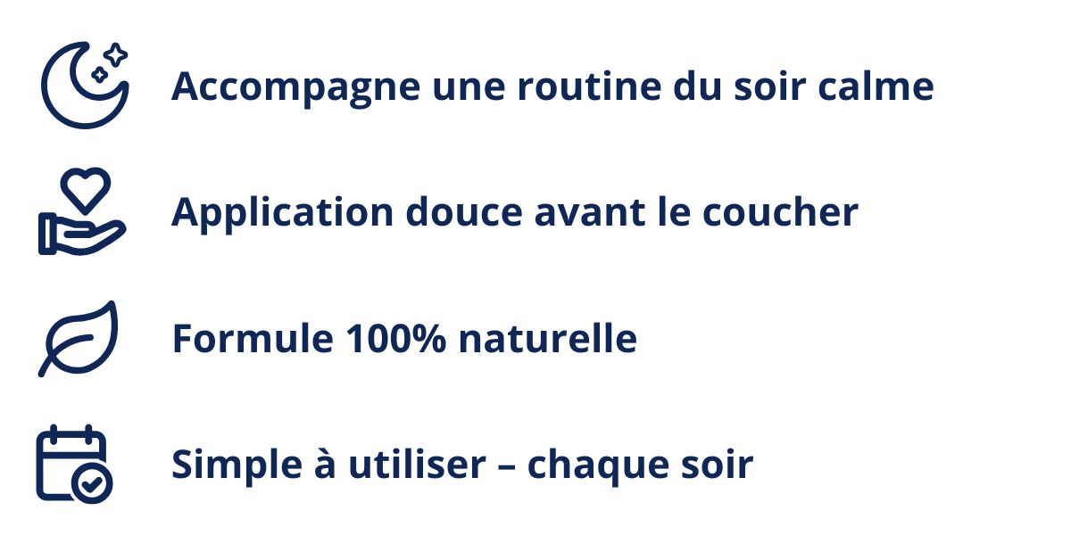 Il s’utilise simplement avant le coucher et agit pendant la nuit, sans comprimé, sans rituel compliqué et sans modifier vos habitudes.